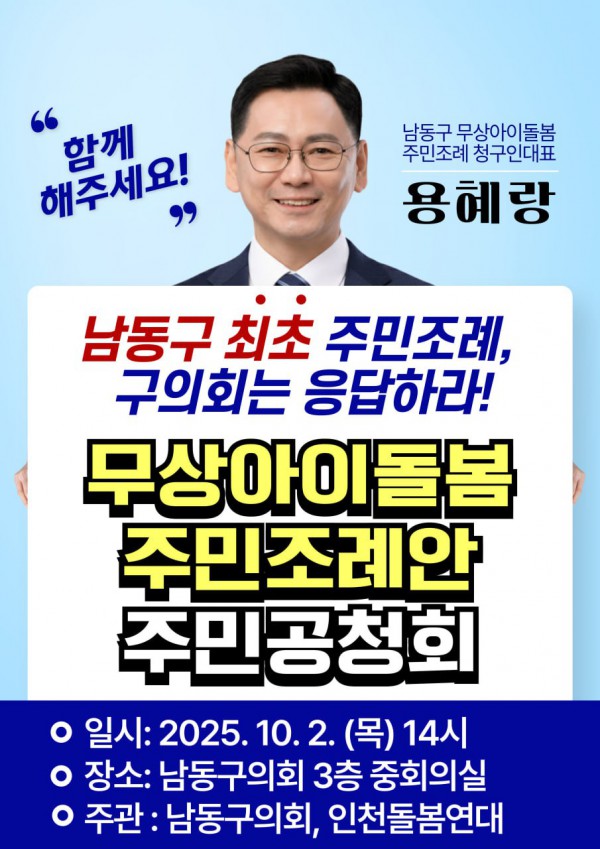 남동구 최초로 주민 5,000명의 서명으로 발의된 '남동구무상아이돌봄주민조례안' 주민공청회가 진행됩니다.